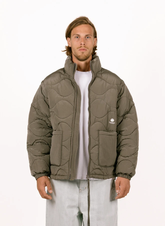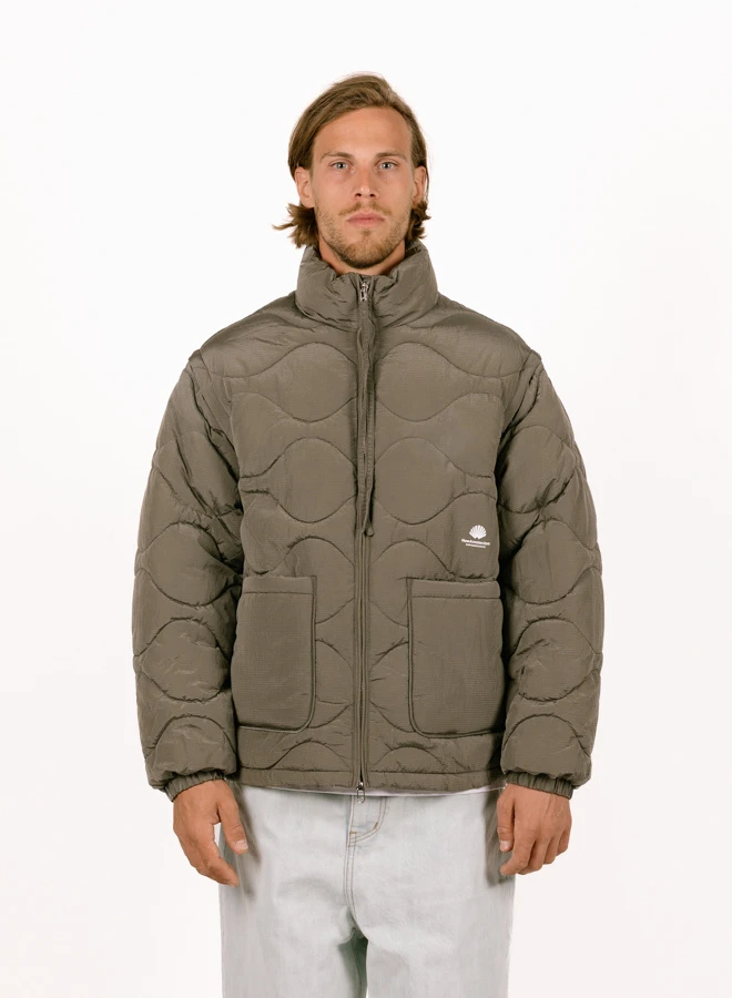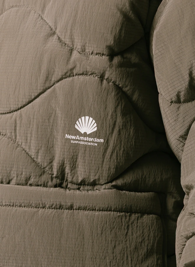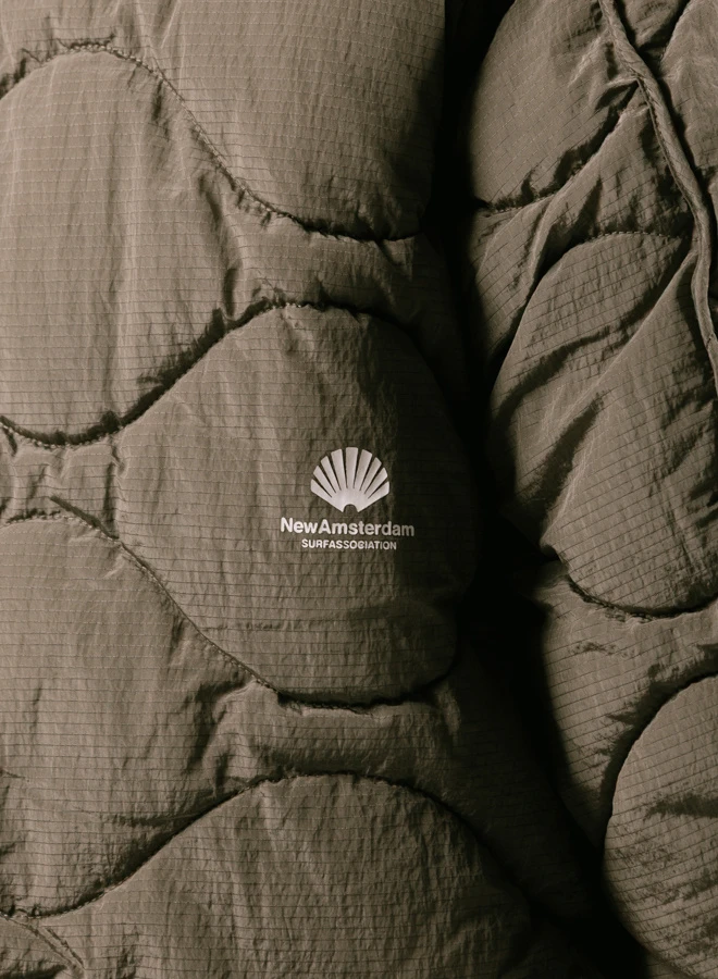 The New Amsterdam Surf Association Detachable Jacket in Dark Taupe blends classic shape with modern performance. Made from shiny ripstop nylon, this padded piece features onion quilting, a metal double zip, and detachable sleeves for added adaptability.